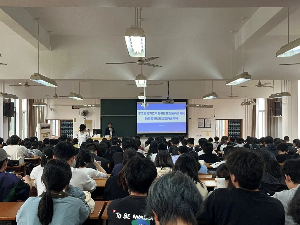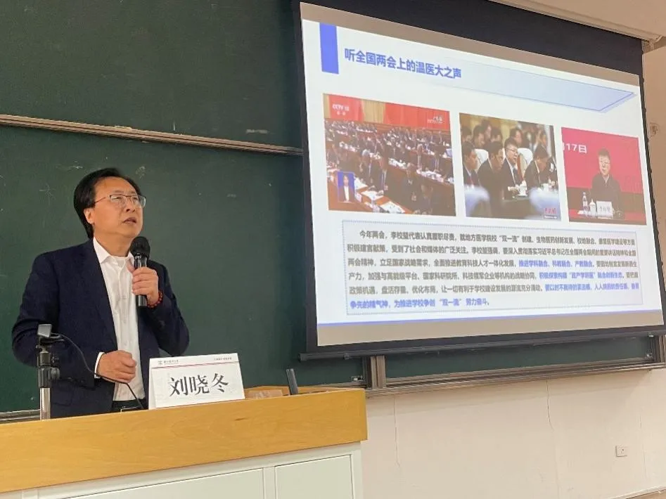 刘晓冬院长在学习活动中,系统阐述了习近平总书记在全国两会期间的重要讲话精神,他指出总书记的系列讲话为公共卫生事业的高质量发展提供了明确的方向指引和根本遵循,强调了以人民健康为中心的发展理念,为国家公共卫生体系的建设注入强大的思想动力。在关注“温医大之声”环节,刘院长详细介绍了全国人大代表、校长李校堃院士提到的“挺膺担当,逐梦星辰大海”、“加强康复学科建设,培养更多康复领军人才”、“AI医疗,未来看病会变成什么样?”、“支持地方医学院校进‘双一流’”、“优化国家战略科技力量布局”等关键词的内容,带领学生共同聆听两会上的“温医好声音”。