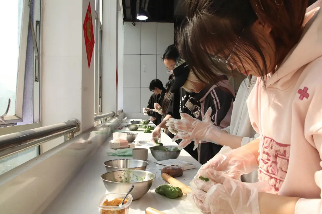从揉制艾草面团到创意造型比拼,同学们化身为“青团匠人”。以寝室为集体,各成员分工有序,从调配馅料到精心塑形,一道道工序配合得相得益彰。在老师的指导下,大家逐步解锁传统技艺。手中的青团,或圆润饱满,或萌趣可爱,不仅裹入了春日的鲜香,更包裹着室友间彼此协作的温暖情谊,传递着文化匠心与健康理念。制作现场,欢声笑语不断,打破寝室的常态,营造出温馨和谐、以舍为家的美好氛围 。