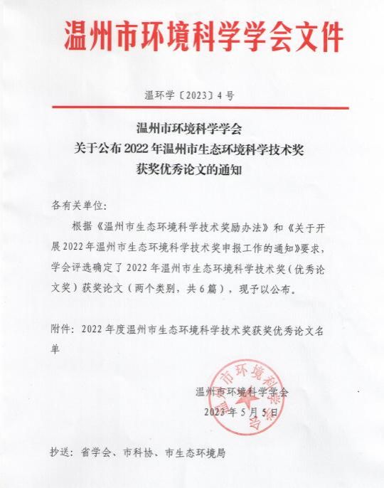 近日,2022年温州市生态环境科学技术奖(优秀论文奖)获奖名单公布。我校作为第一单位喜获2项温州市生态环境科学技术奖,其中一等奖1项,二等奖1项。