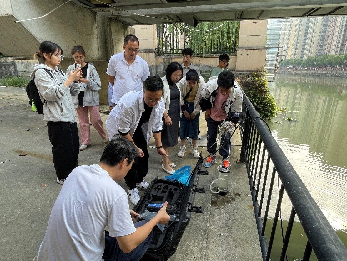 党支部书记商栩老师从水色、透明度等特征对下横河水质进行了初步研判,并示范了YSI多参数水质监测仪的使用;黄树辉老师指导学生进行水样采集,并讲授了水温、pH值、透明度等水质参数的检测方法。同学们及社区群众积极参与,亲自体验了YSI水质检测仪等仪器设备的使用,采集了水样并做好记录用于后续实验室检测。