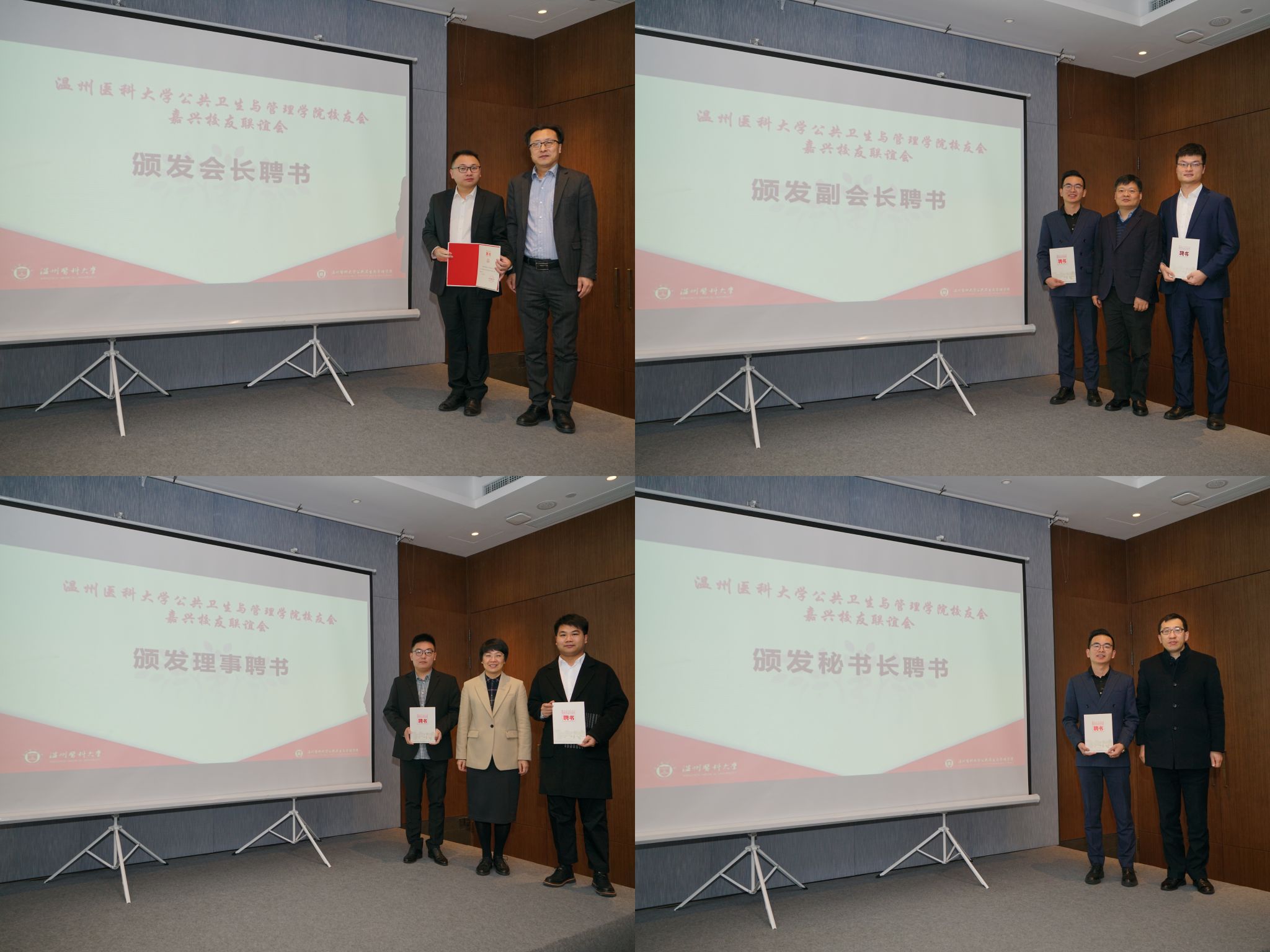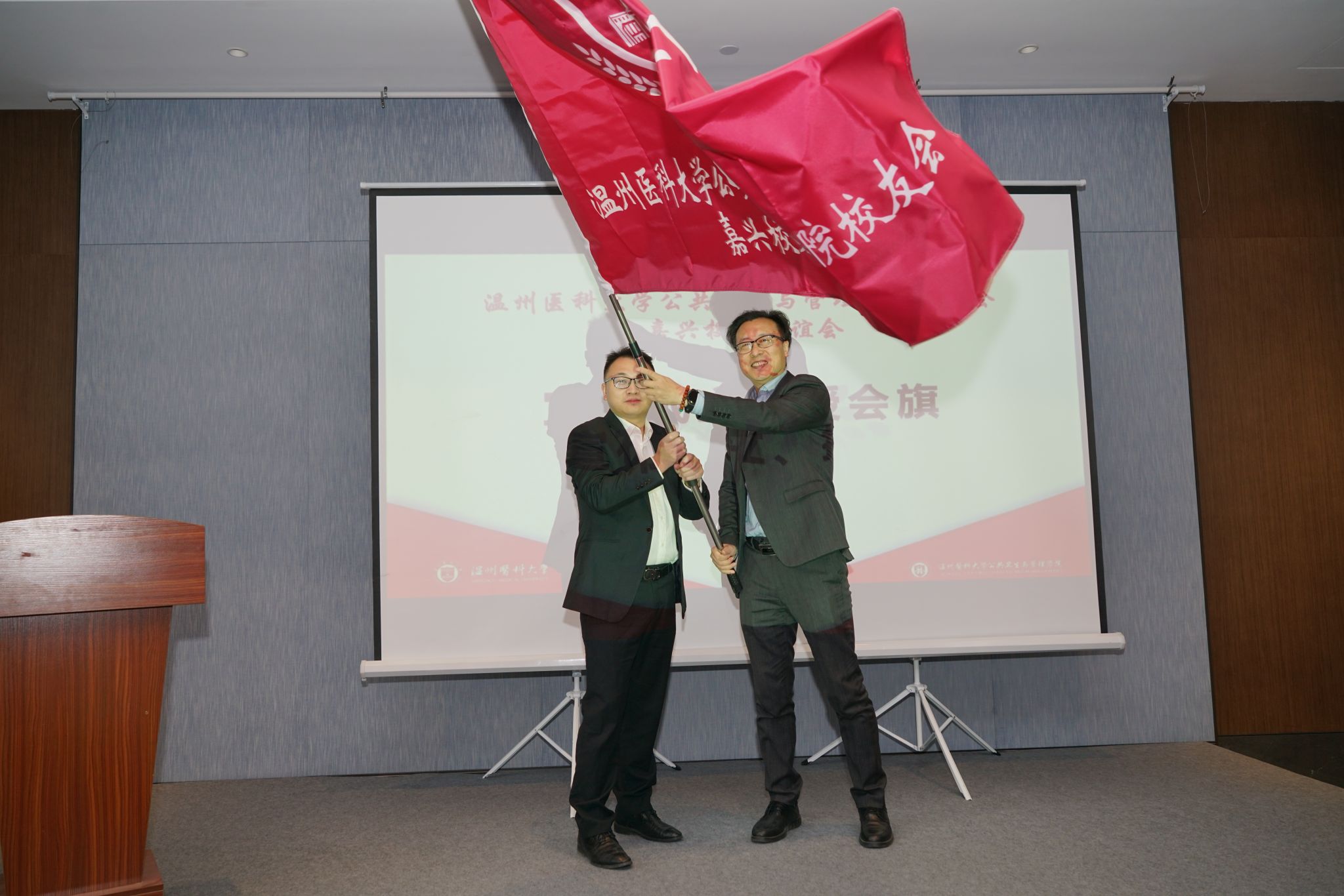 公共卫生与管理学院院长刘晓冬宣布公共卫生与管理学院校友会嘉兴校友联谊会正式成立,并为联谊会会长林叶斌授旗。现场嘉宾为联谊会会长、副会长、秘书长、理事们颁发聘书。