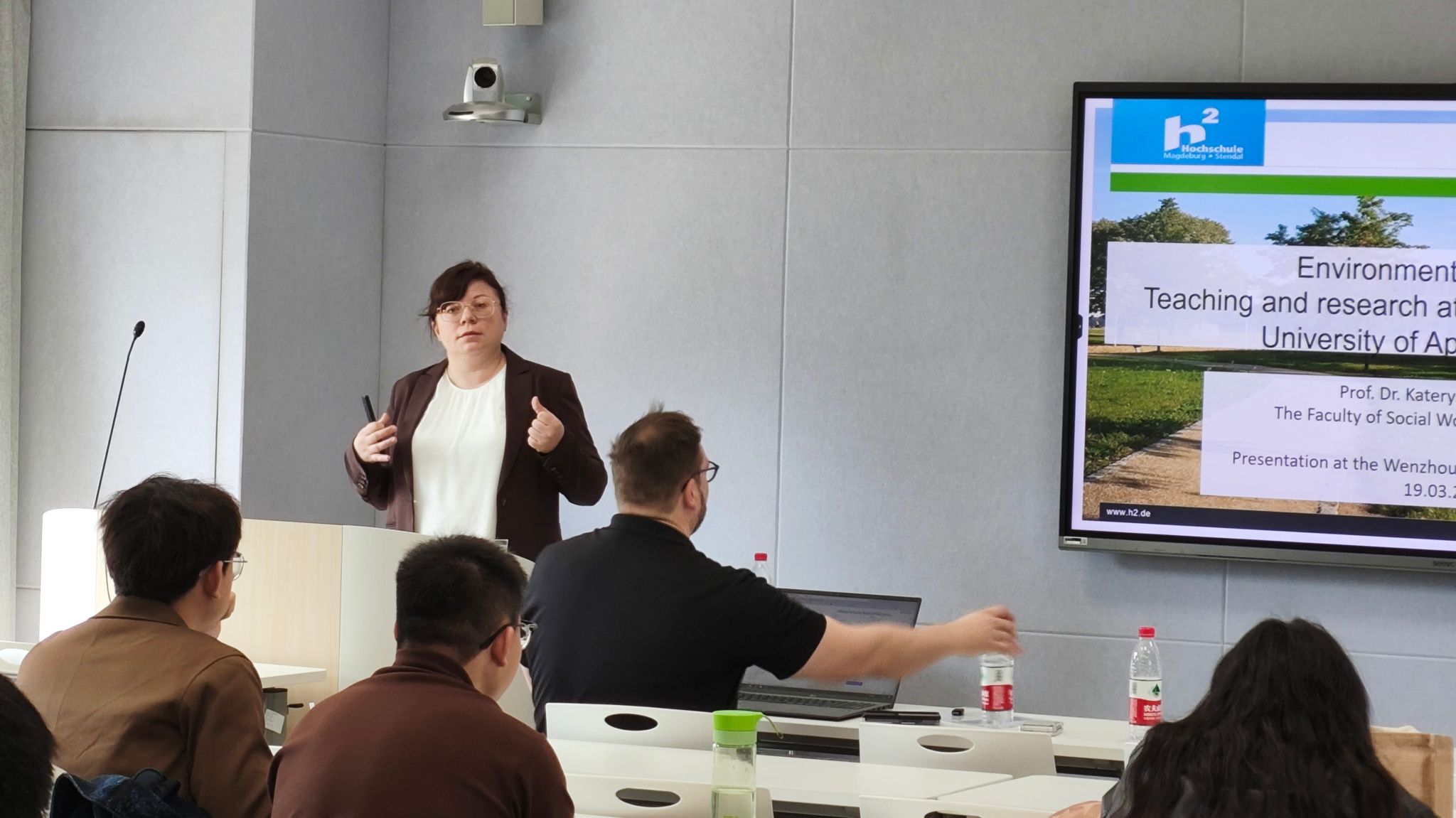 Kateryna Fuks教授以“Environment and Health:Teaching and research at the Magdeburg-Stendal University of Applied Sciences”为题,围绕空气污染和心血管疾病、城市绿色基础设施与卫生情况、教学活动3大模块,系统性阐释了教授对环境与健康领域的独到见解。讲座结束后,Ralf Lottmann教授与Kateryna Fuks教授同学院师生进行了深入的互动交流。