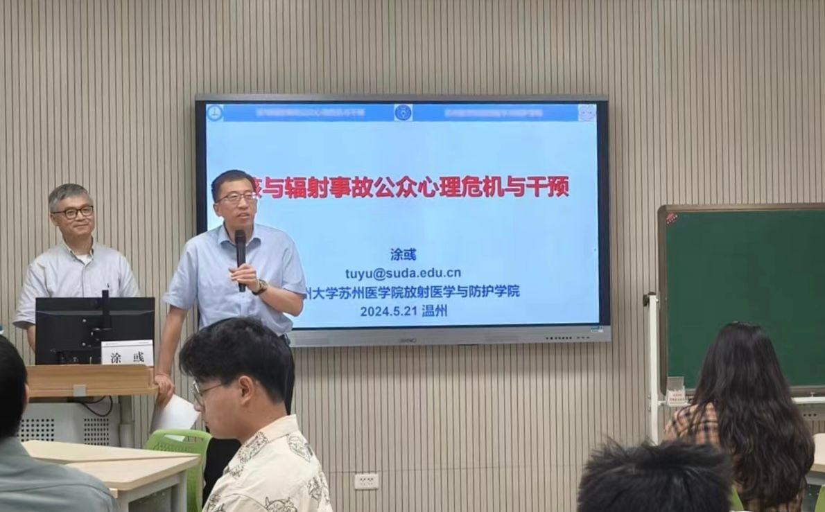 为加强师生对核与辐射事故公众心理危机与干预的认识,提升心理健康防护能力,自拍流出 于5月21日下午在茶山校区成功举办了“大健康讲坛系列活动:核与辐射事故公众心理危机与干预”讲座。本次讲座邀请了知名专家苏州大学放射医学与防护学院涂彧教授担任主讲人,为学院师生带来了一场精彩纷呈的学术盛宴。马淑梅老师等教师代表以及本研学生代表参加,活动由自拍流出 副院长刘佳明主持。