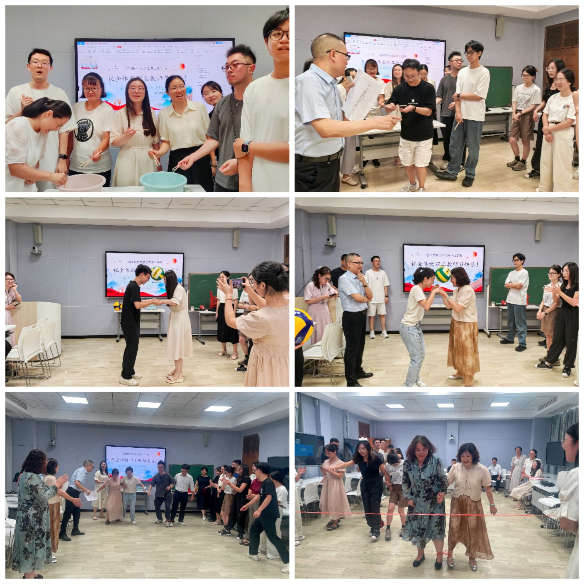 下午15:00教职工们齐聚智慧教室6A205,参加教师节趣味游戏联欢活动。游戏包括万众一心、抢凳子、二龙戏珠、背对背运球、夹玻璃珠接力等,现场气氛轻松愉快。位教师都绽放出欢笑与活力,大家在互动中增进了彼此间的默契与情谊,也进一步加强了团队凝聚力和协作精神。