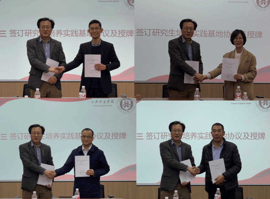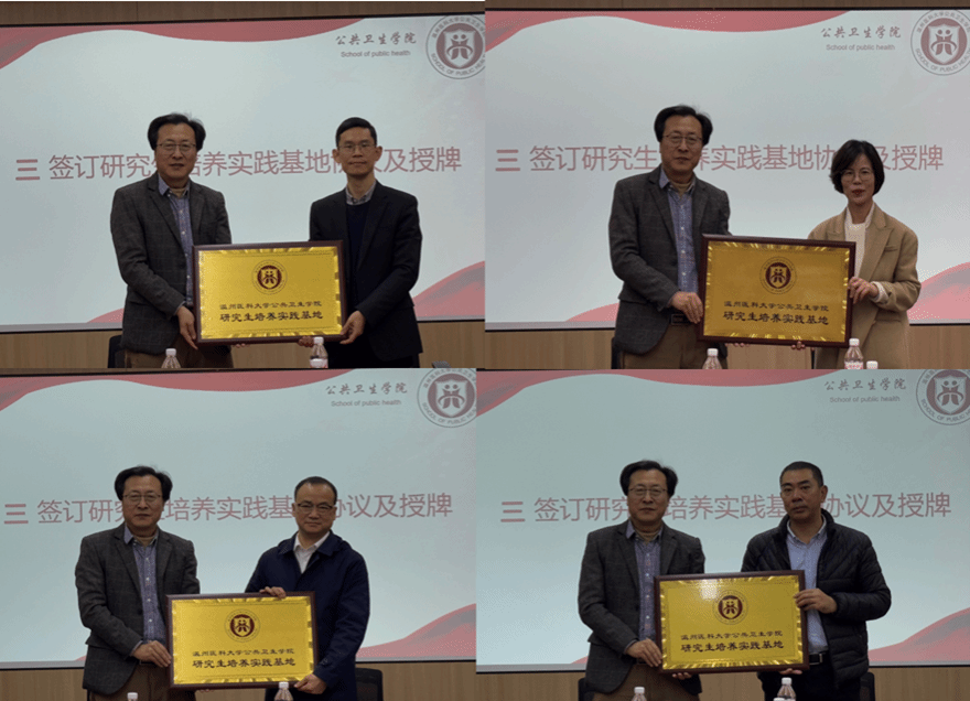 研究生培养基地代表温州市疾病预防控制中心(温州市卫生监督所)余向华讲话。他高度评价了学院在人才培养与科研合作方面的贡献。他强调,研究生培养实践基地的建设是双方战略合作的新起点,将以此为契机,遵循创新机制、互惠共赢、责权明确、管理规范的原则,以实践基地为依托,从强化沟通、推选优秀公共卫生校外实践导师和构建人才培养平台等三个方面发挥好基地的综合优势,为培养高质量、高层次、高素养的应用型公共卫生人才提供有力支持。